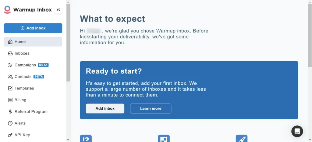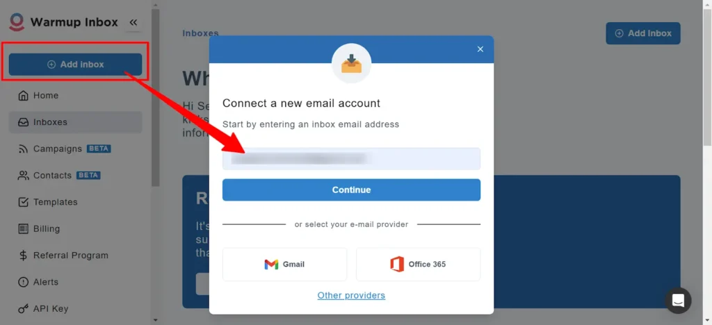 To start, sync your email account with Warm Up Inbox. To do this, login to your Warmup Inbox account. Click the Add inbox button and input your email address.