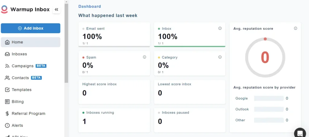 - Reputation Score – Monitor your inbox health and deliverability over time.