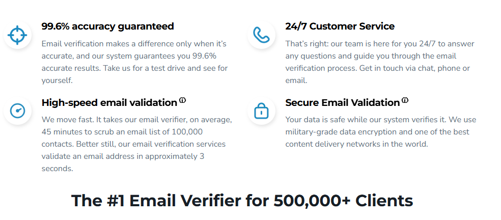 | Bouncer | 98.9% | ~7 min | 100 credits | $20 / 5,000 | 4.8/5 | Avoiding spam traps + protecting sender reputation |