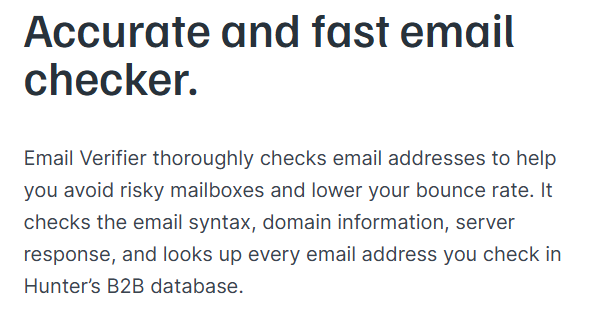 Hunter is well-known as an email finder, with a verifier that fits cleanly into the same workflow. It’s simple, fast to use, and ideal when you just need to confirm addresses before sending outreach, especially on small lists. It’s not the deepest verification engine, but the convenience makes up for it.