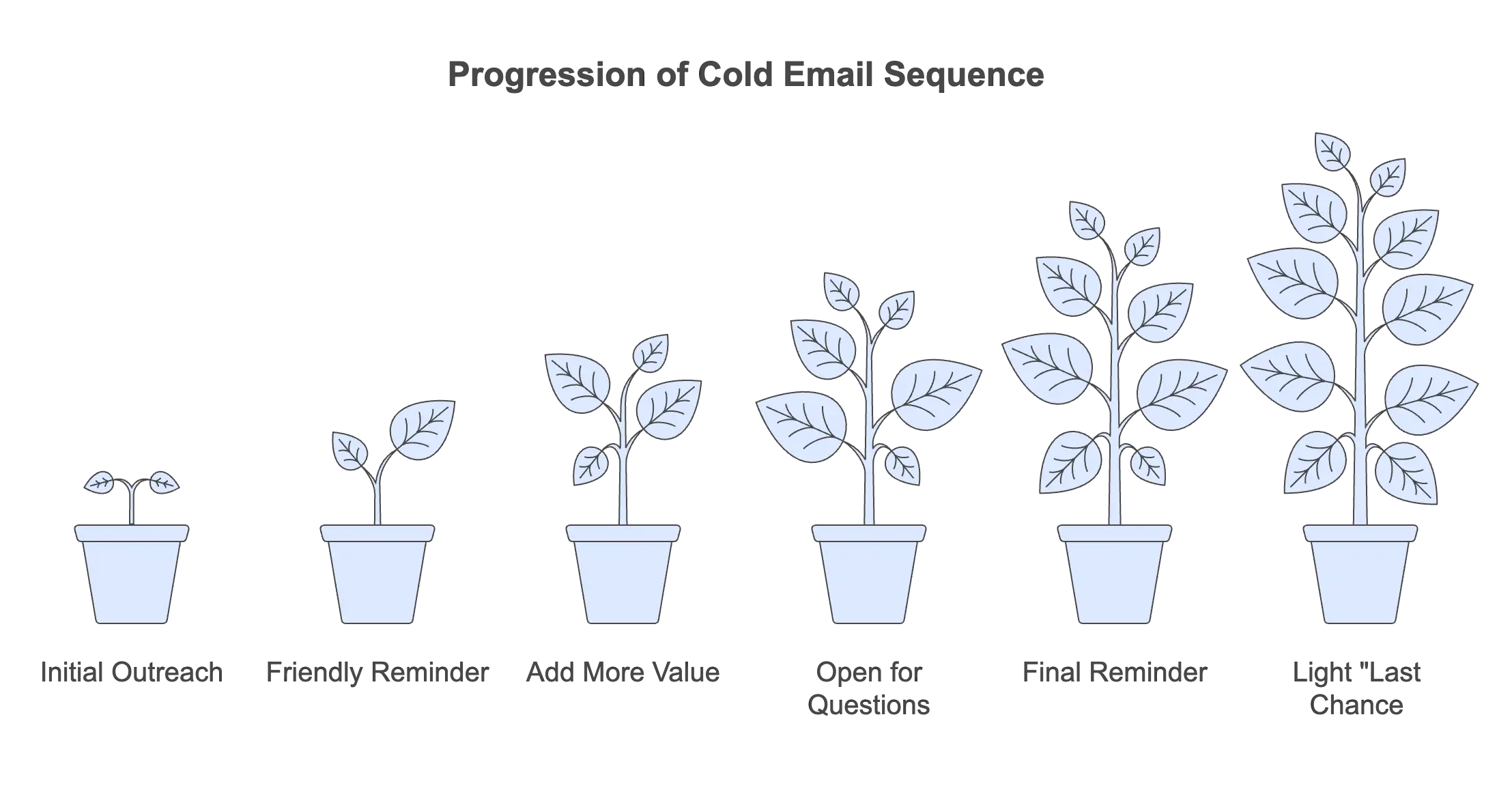 For a balanced, effective cold email sequence, aim for 4–6 emails. This range allows you to stay on the recipient’s radar without overwhelming them. Here’s a simple structure: