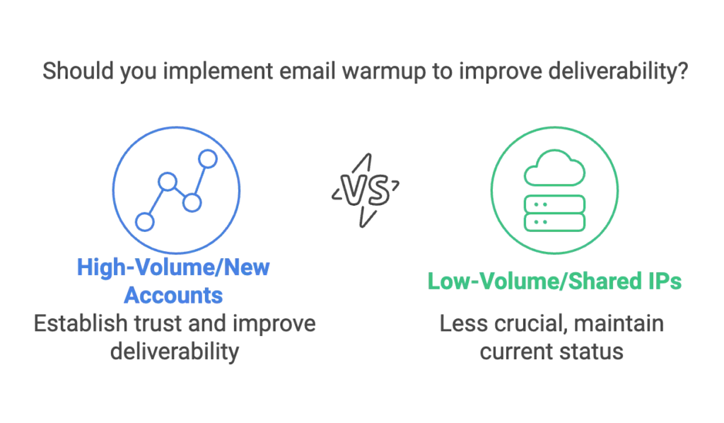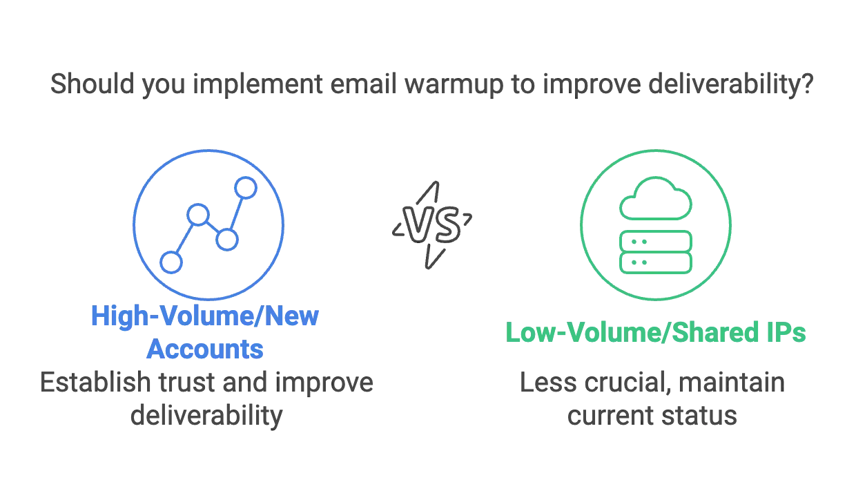 Email warmup is critical for high-volume, new, or dormant accounts to establish trust with ESPs, making it an essential practice for maintaining high deliverability. For lower-volume senders or those using established shared IPs, the need for a warmup is less crucial.