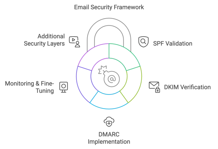 DMARC ties together SPF and DKIM and provides visibility into email activity. Implement DMARC with an initial monitoring policy (p=none), then gradually enforce stricter policies (quarantine or reject) as needed. Use DMARC reporting tools to identify unauthorized email attempts and fix configuration issues.